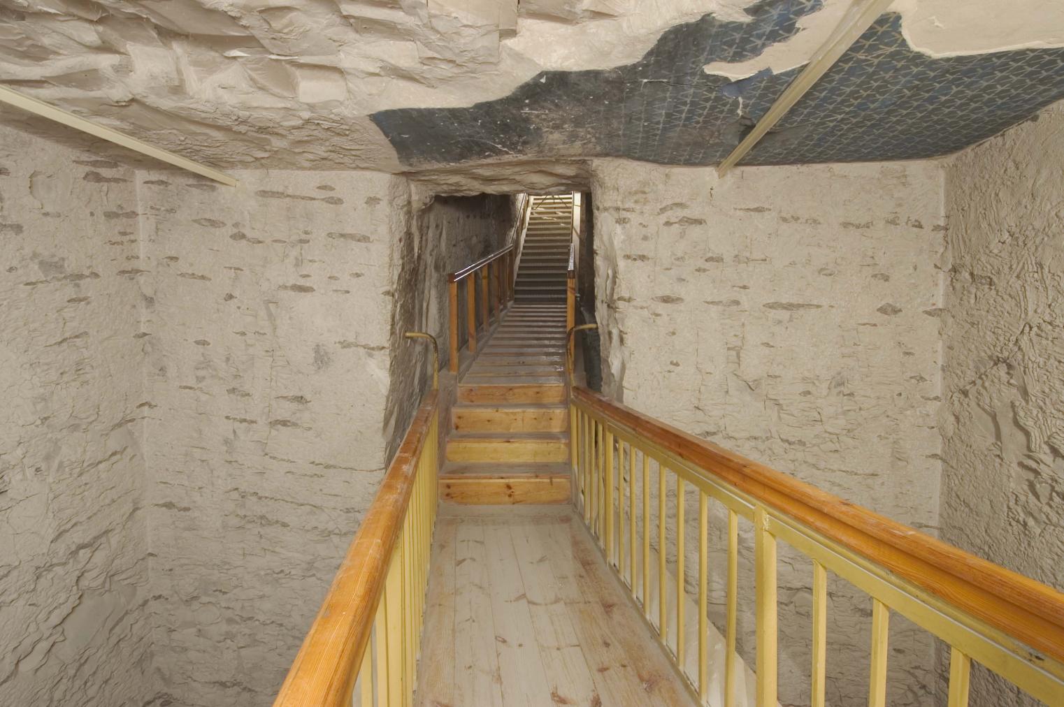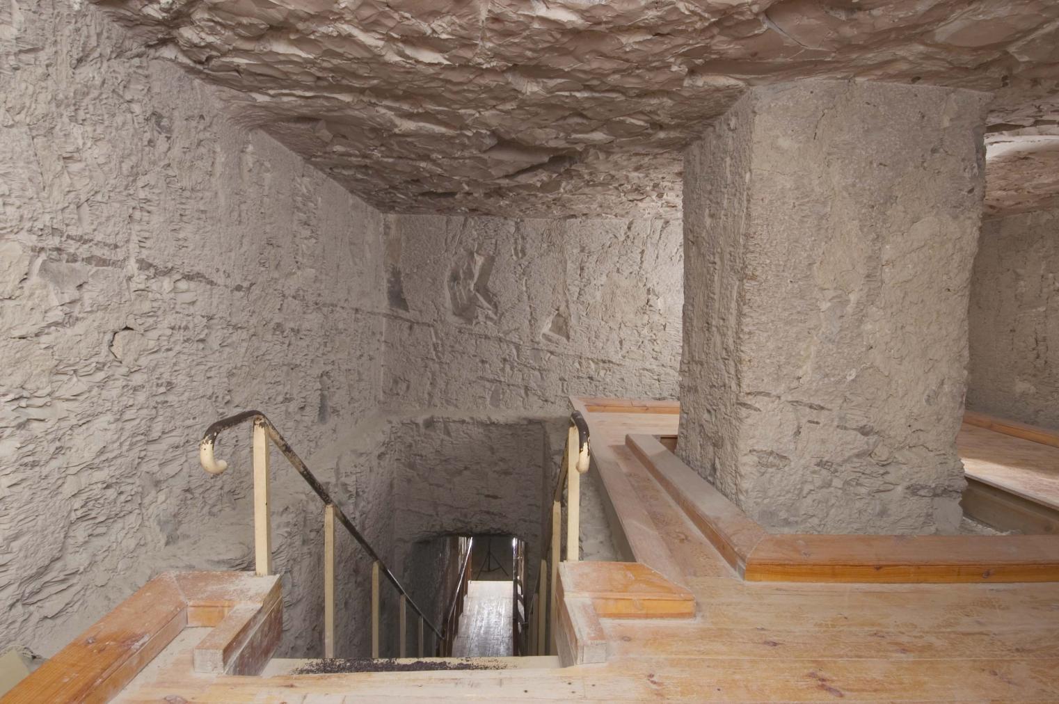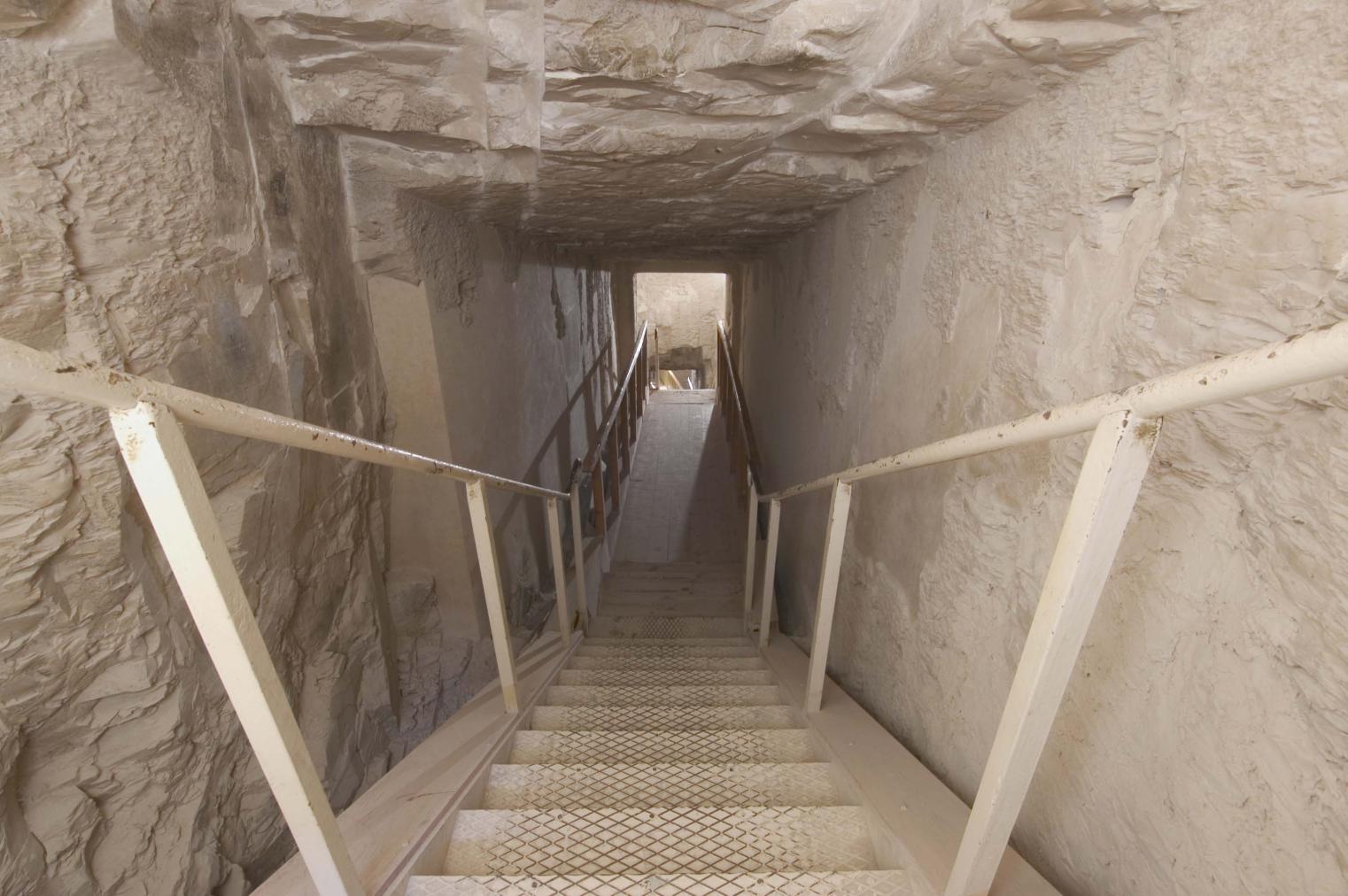 See entire tombThere is a change in the slope of both floor and ceiling. There may have been an ancient stairway or ramp in the first half of this corridor but it has been heavily damaged by the installation of modern steps.