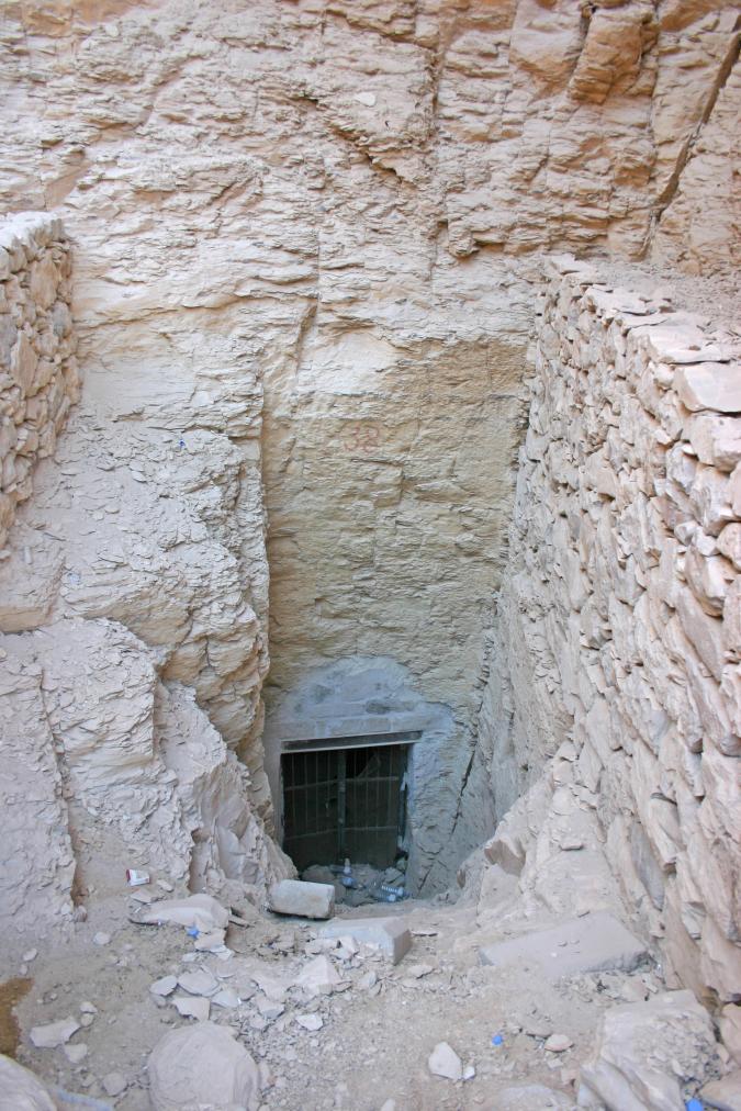 See entire tombThe entrance is well-concealed at the base of a cleft in the cliff face. The entry stairs are poorly preserved and descend to a small gate. The cliff wall above the entrance is simply smoothed over. Foundation deposits were found before the entrance by Carter in 1919.