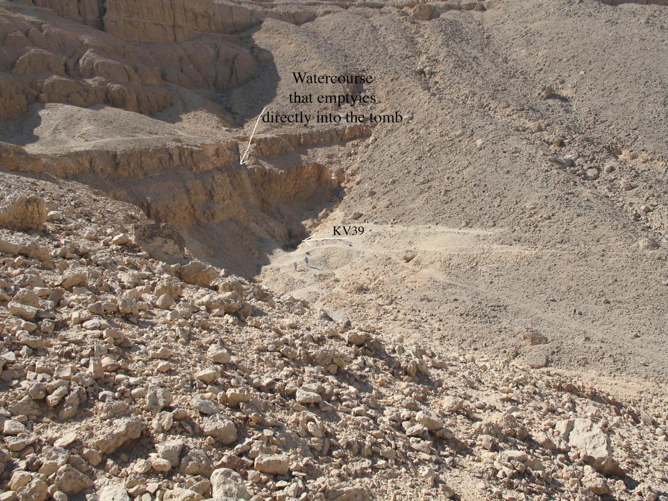 KV 39 is located at the head of a water course on the plateau above and to the south of KV 34. The entryway stairway (A) is cut in the side of the hill below al Qurn followed by a sloping corridor (B1) that has been enlarged to the south at its lower end (B1a). Beyond this corridor, a rectangular chamber (C1) extends to the north of the axis. There is a stepped descent cut on the axis in the floor at the south end of this chamber. Two other descending corridors open off the south extension B1a. One descends southwards from a stairwell in the floor and continues as a rough cut sloping corridor (B3) to another stairwell (C4) leading to a rectangular burial chamber (J2) extending to the east with a pit in the floor beneath the rear wall. The other set of passages extends on a west-east axis parallel to the entrance.