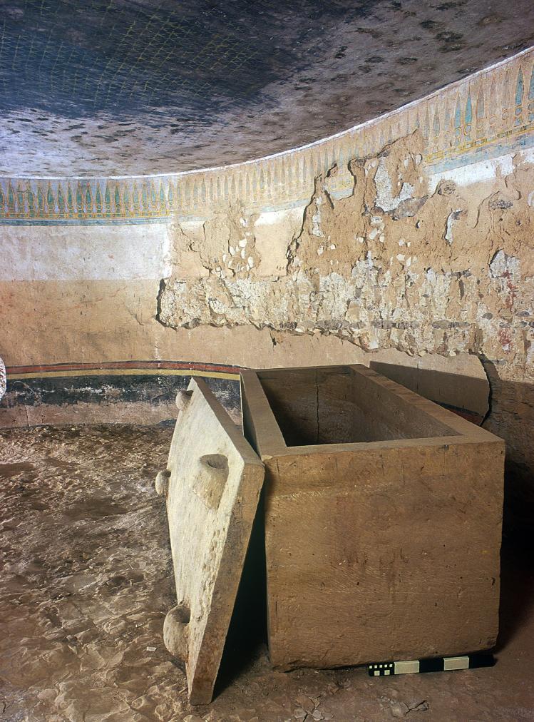 See entire tombThe burial chamber lies on an west-east axis and is cartouche-shaped. It has two pillars; the west one is damaged, the east one badly broken. The sarcophagus lies in the east section of the chamber. There is a kheker-frieze, a star pattern on the ceiling, and a band of color below the decorated area of the wall. Several copper pins are still in place at the top of the west wall. Holes for others can be seen on other walls. They may have served as pins for plumbbobs. The walls of the chamber were plastered, but the decoration was never finished.