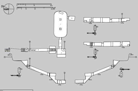 KV 42 is located in the south branch of the southwest Wadi. A steep stepped entryway (A), a steep corridor (B), and a stairwell (C) lead down to a chamber (F) where the axis turns ninety degrees to the left (east). Another corridor (G) leads to the cartouche-shaped, pillared burial chamber J, which is flanked by a side chamber (Ja). Except for an unfinished star pattern and a kheker-frieze in burial chamber J, the tomb is undecorated.