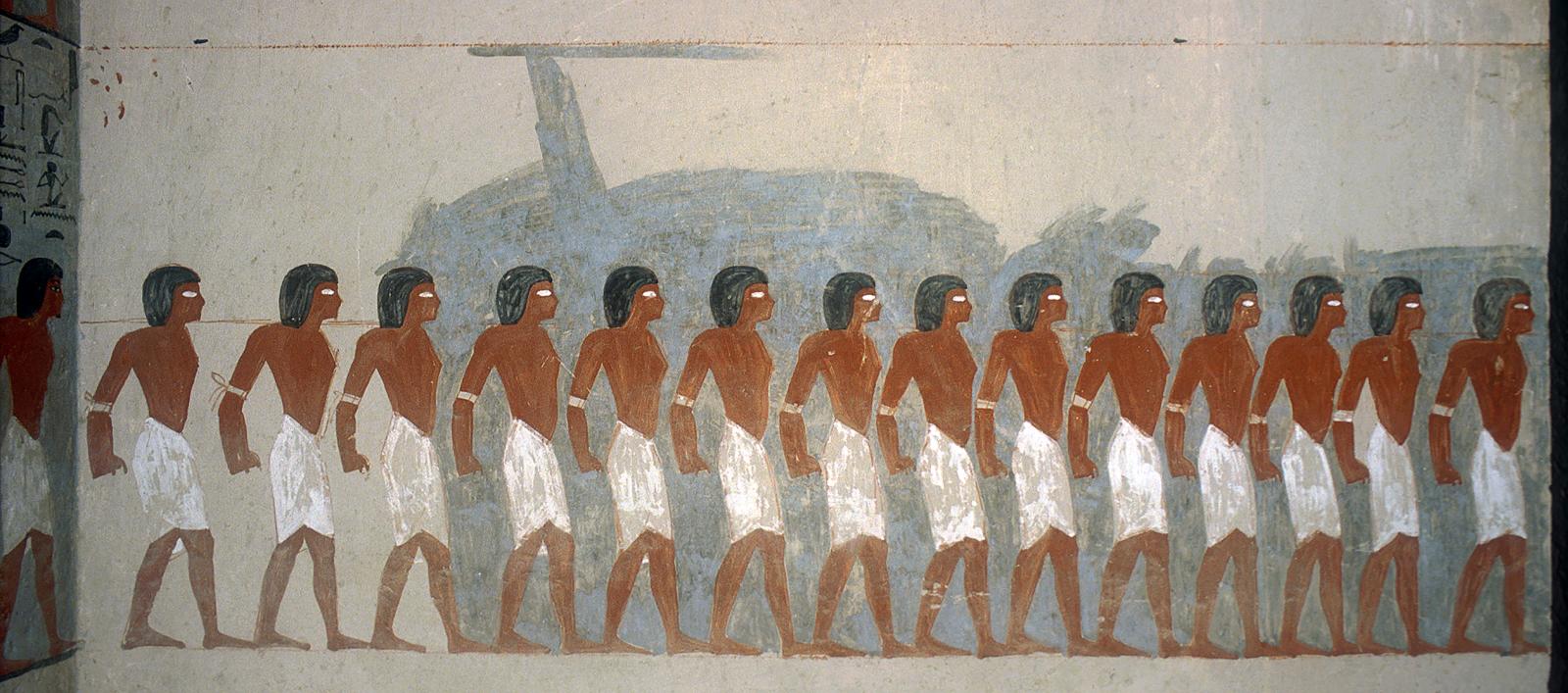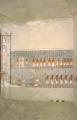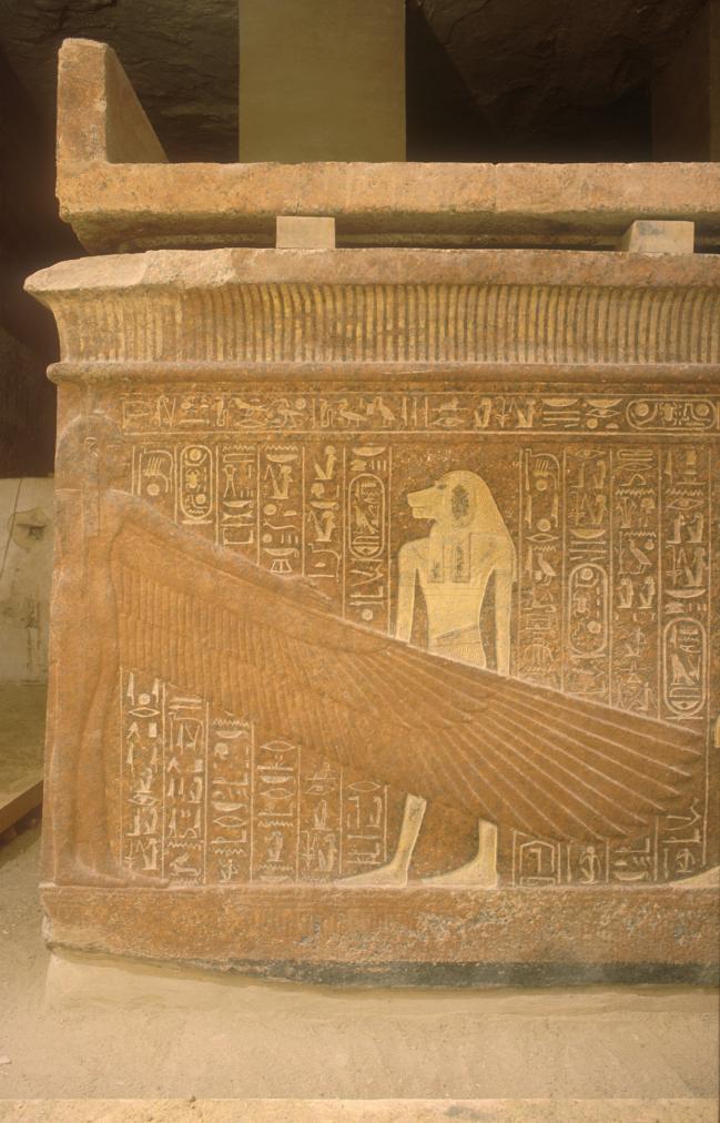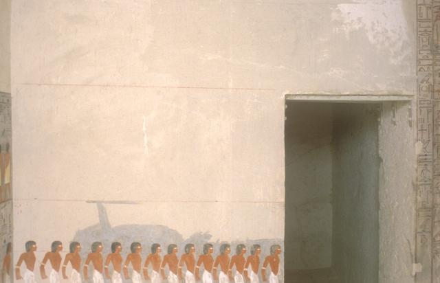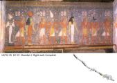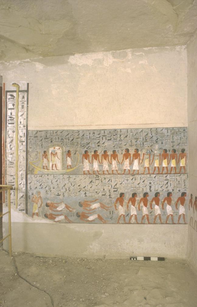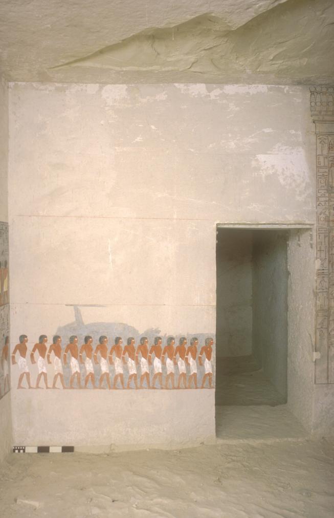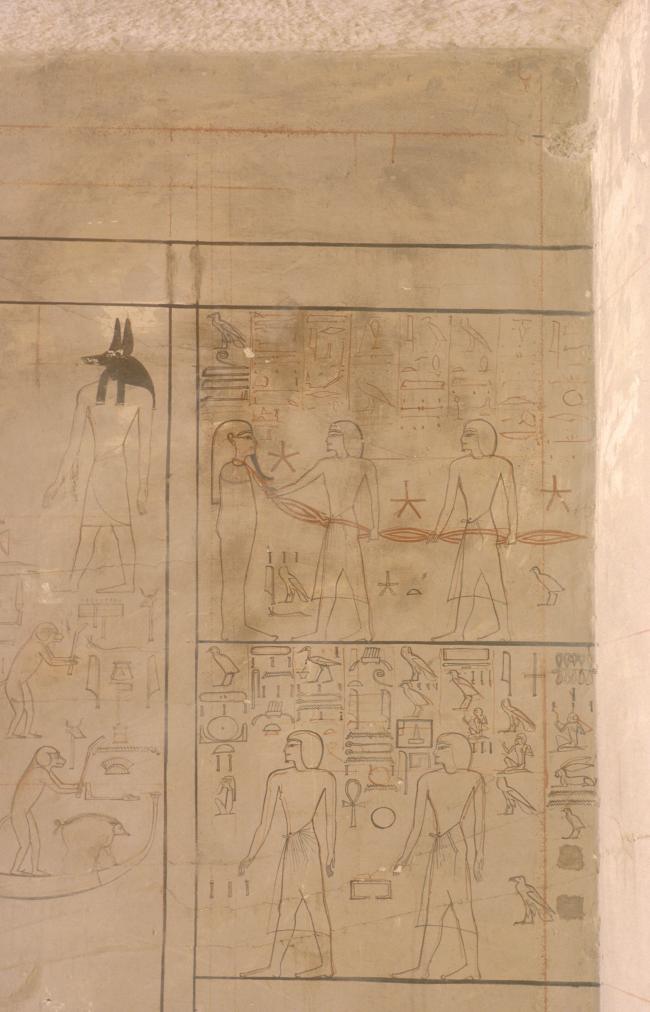 The decoration is of particular interest here not only for the innovative subject matter, but its unfinished nature shows the different stages in the work of the artists. As in well chamber E and chamber I, the intended decorative technique was to have been raised relief. The relief carving was left unfinished, however, and the only painted decoration was on the uncarved plaster surface in the southwest corner. Preliminary sketches on the right, left, and rear walls preserve excellent examples of the first stage of the decorative process.