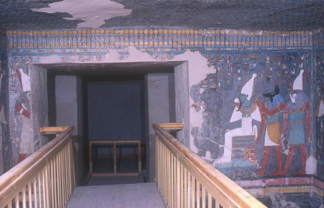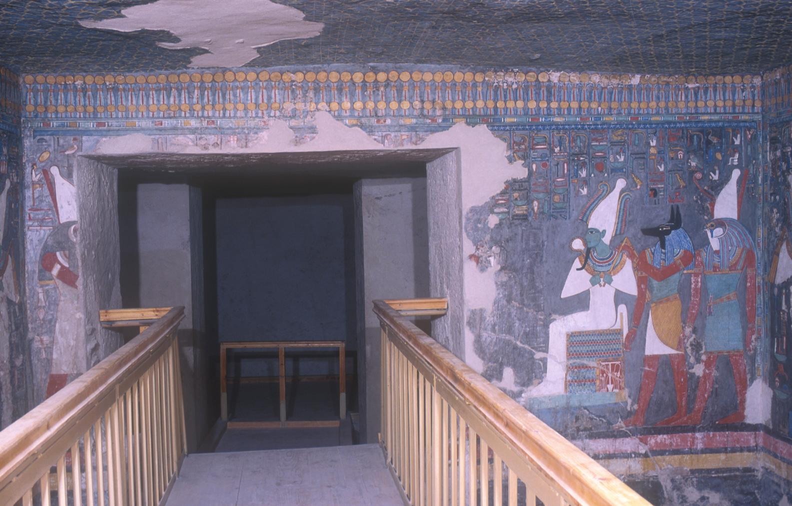 See entire tombThis chamber has a well shaft, today partly filled with debris, although the excavators reported a small chamber opening off the bottom. A concrete and iron bridge has been constructed over the well shaft. The chamber is decorated with representations of the king with various deities.