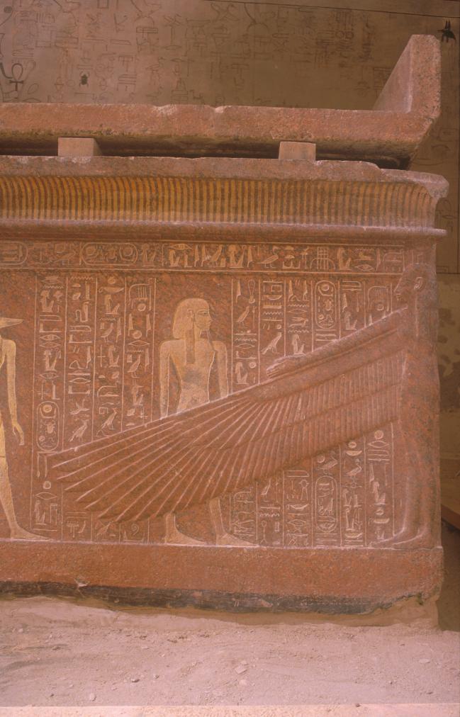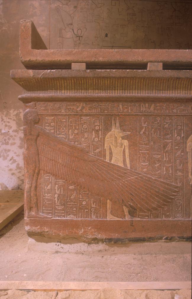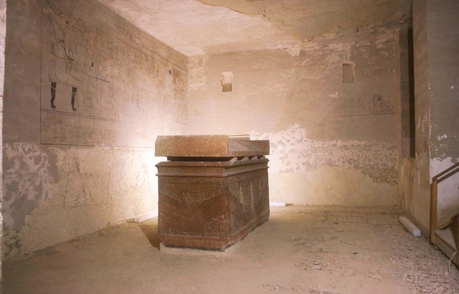 See entire tombThe burial chamber is divided into two parts: a pillared section which is level with gate J and a lower section reached by two stairways, one between the last set of pillars and on the other to the left (west) of them. The pillared section consists of three pairs of pillars, some of which have undergone restoration. A gently sloping ramp begins its descent between the first set of pillars and leads to the stairway which lies between the last set. The second stairway was cut in the floor to the west of the first set of stairs, but it was filled in during the restoration process. The pillars were also restored and partially reconstructed at this time. The lower level has a flat ceiling. There is a large red granite sarcophagus placed off-center on the floor. Chamber J has gates to five side chambers, two in the rear (west) wall, one in the right (north) wall, and two in the left wall.