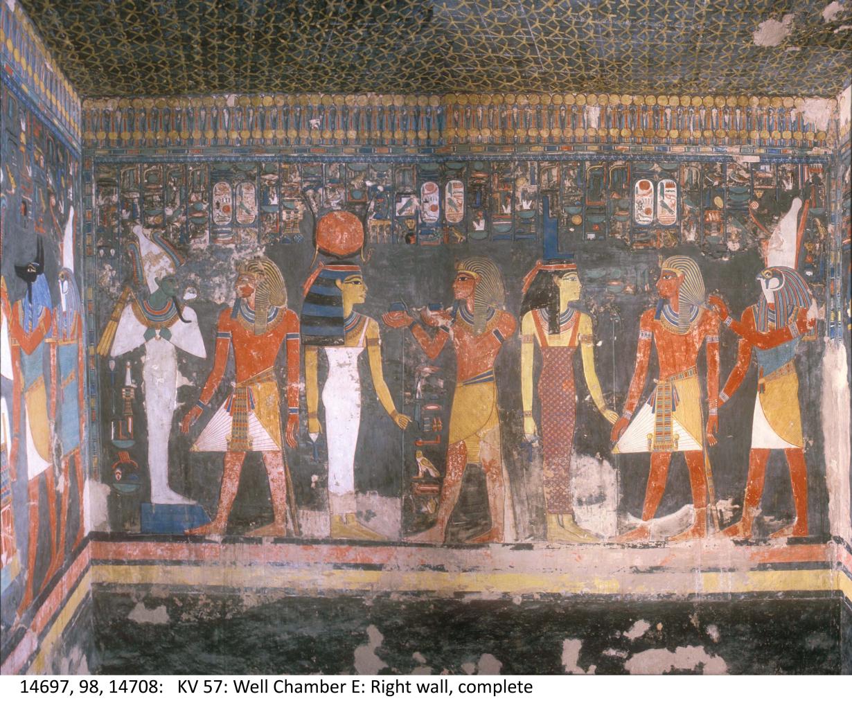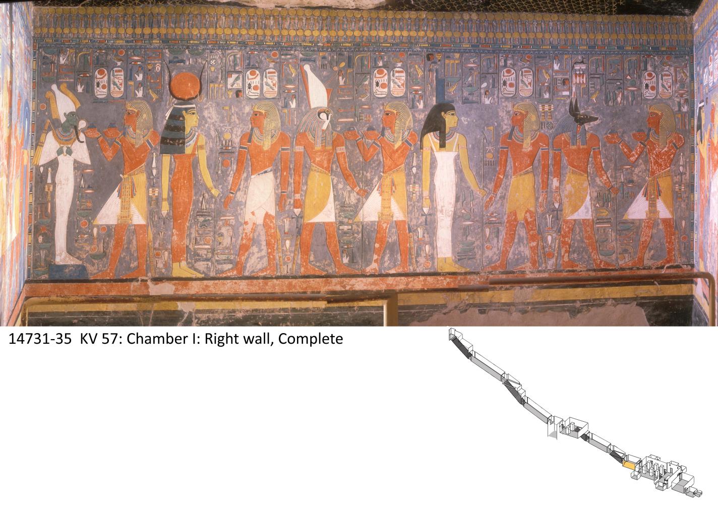 KV 57 is located in the west branch of the southwest Wadi. The tomb's opening, just above the Valley's ancient floor, is low in the south side of a hill that projects eastward into the central wadi from the cliff face where KV 35 (Amenhetep II) is cut. Three sloping corridors (B, C, D) lead to a well chamber (E) and a pillared chamber (F). A side descent and two sloping corridors (G and H) lead to chamber I giving access to the burial chamber J. This has side chambers (Ja-Je), also with side chambers (Jaa, Jbb, Jcc, Jccc). The tomb represents a transition in tomb architecture from the bent axis plan, characteristic of Dynasty 18, to the straight axis royal tombs of Dynasties 19 and 20. The decoration is composed of representations of deities (well chamber E, chamber I, gate J, side chamber Jb), Horemheb with deities (well chamber E, chamber I), and scenes from the Book of Gates (burial chamber J).