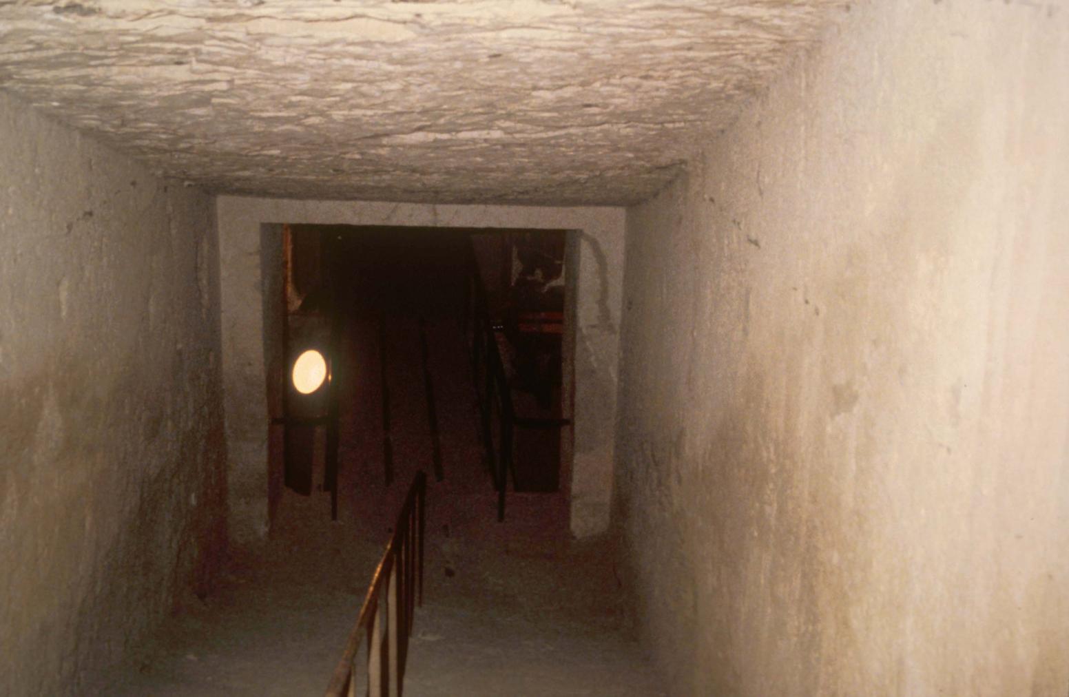 See entire tombThis chamber exhibits another architectural innovation: its long axis is roughly parallel to the axis of the upper corridors, and the axis of the stepped descent and the lower chambers are parallel and offset to the west. The excavators noted the presence of blocking in the descent that had been broken through in antiquity. There are two pillars in the chamber. There is a round hole in the left (west) wall above the descent.