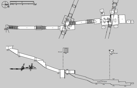 This tomb descends with the steepness of earlier tombs in the Valley of the Kings, but several unique features were added. A Ramp descending to a set of stairs was cut between the pillars of the burial chamber J; a second set of stairs was cut beside the first. Both lead to a crypt on a lower level. Also, a lower side chamber (Jaa) was cut beneath side chamber Ja. The decoration in the burial chamber and other parts of the tomb was left in various stages of work, allowing scholars to study the processes involved in preparing painted relief. KV 57 is the first tomb to show the Book of Gates.