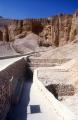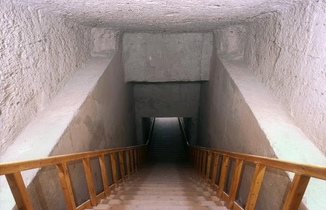 See entire tombTrapezoidal recesses flank the steep stairway, which has a second overhang above the bottom. The latter occurs for the first time in the Valley of the Kings in this tomb.