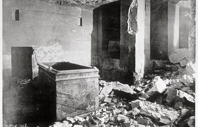 No remains of Horemheb were found, but evidence exists that the tomb was at one time sealed, at least from gate F onwards. The broken lid of the Sarcophagus found lying on the floor, as well as the shattered condition of the Canopic chest and other burial furnishings, suggest that the burial was robbed. Several Hieratic inspection dockets from Dynasty 21 may record temporary caching of burials here before they subsequently were removed, perhaps to KV 35.