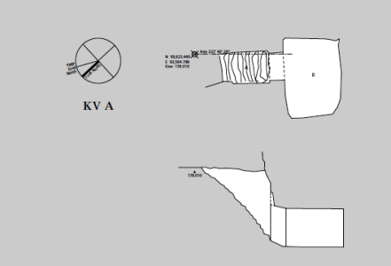 KV A, located in the West Valley, is cut into the base of the cliff at the head of a water course 60 meters (197 feet) south of the entrance to KV 22. Perhaps originally intended as a tomb, it was reused as a storeroom for material from KV 22. An entryway of rough Steps (A) descends to a gate (B) that still retained much of its rubble blocking. The single chamber B inside the gate was partly filled with limestone chips and dirt. Numerous fragments of broken pottery vessels, some with blue painted decoration, were found in the debris. Jar sealings and dockets name Amenhetep III and give dates in his regnal years 32 and 37. Other artifacts are associated with tomb decoration, including limestone Ostraca with sketches, ceramic fragments used for holding pigments, lumps of plaster, and rope.