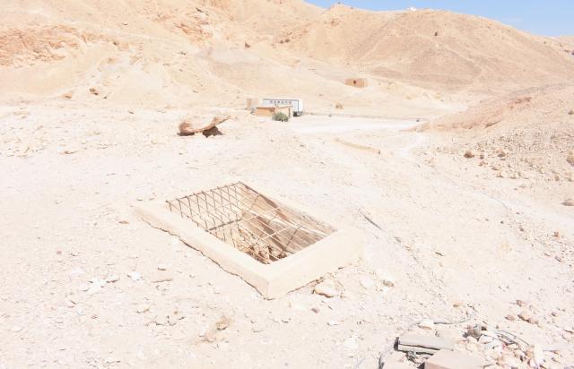 QV 17 is a single-chambered shaft tomb located on the south side of the main Wadi, behind a low natural mound into which a number of tombs are cut. The shaft (A) has a modern masonry and cement surround at its opening, spanned by a metal grill. The main chamber (B) is slightly offset from the tomb’s shaft axis and the ceiling is only preserved at the rear of the chamber. As with other 18th Dynasty shaft tombs, it was not decorated.