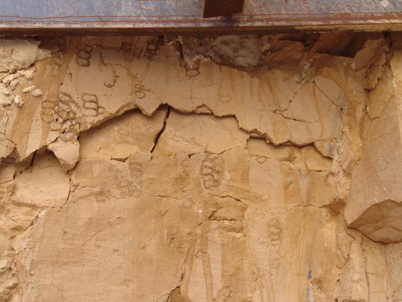 According to the GCI-SCA, two steel raking shores have been installed to support the upper portion of the south wall of the main chamber, where a large open vertical east-west oriented fracture exists behind the face of the wall. Wooden post and beam shoring supports the undercut south wall of the side chamber. Mortar repairs, probably using a gypsum and white cement mixture, have been carried out liberally to fill rock fractures and to prevent further rock loss, particularly in the side chamber. The mortar has been applied in a fracture between the layer of shale and the marl above, but the current presence of a wide crack between the mortar and the marl above is evidence of movement since the repair. Edging repairs and plaster fills were previously undertaken around areas of surviving painting in an attempt to stabilize the paintings.