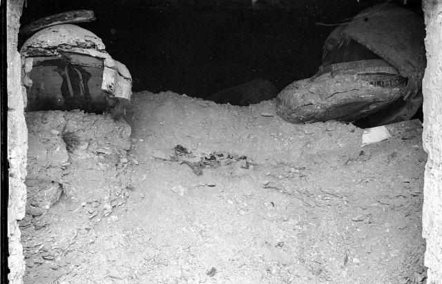 See entire tombThis chamber lies on axis with the tomb's entrance and the floor is lower than the preceding gates and corridors. A side chamber lies to southeast and a rear chamber is situated to the southwest along the tomb's axis. The walls and ceiling were not packed with infill material, but simply plastered over. A large concave area of the ceiling collapsed and was replastered in antiquity. Decoration in this chamber consists of reliefs that were roughly executed and not painted and is uniformly lost along the lower third of walls (approximately 0.5m high). This may indicate the likely the level of debris or sediment fill associated with past flooding.