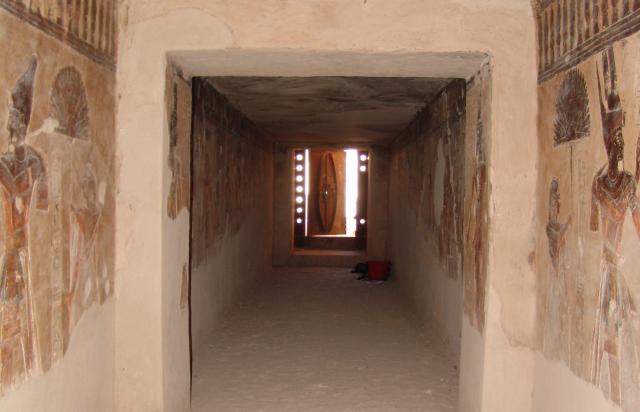 See entire tombThis corridor lies on axis with the tomb's entrance. The walls are protected with a wooden barrier and lit with fluorescent lighting, while a wooden walkway has been erected over the floor. The decoration is unfinished at the rear end of corridor (reliefs are roughly executed and not painted). There are localized areas of rock loss, the most substantial of which are one area on the left wall of the corridor. Decoration is uniformly lost along the lower third of walls (approximately 0.5 m high), indicating most likely the level of debris or sediment fill that may have been associated with past flooding.
