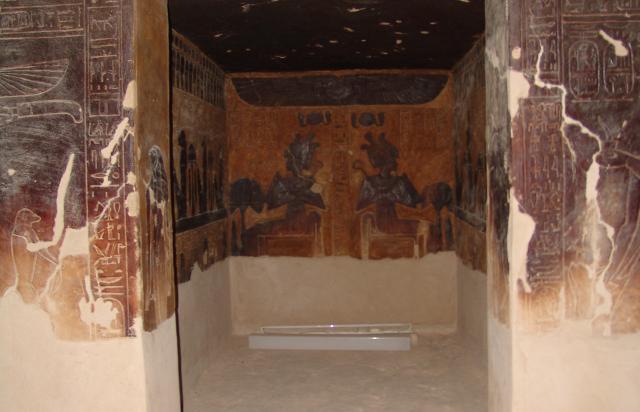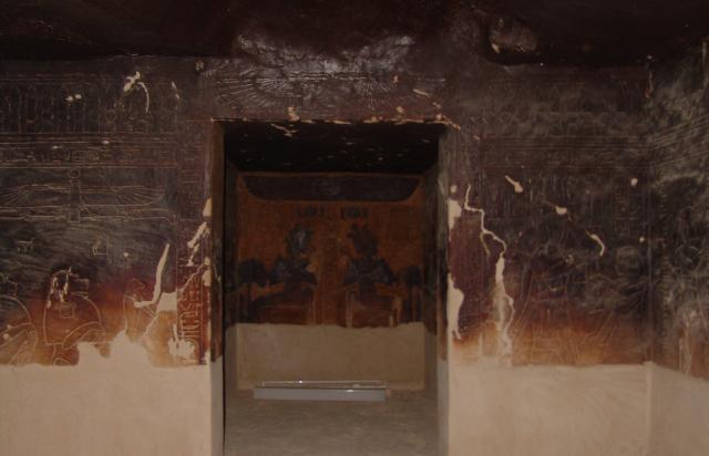 See entire tombThis chamber lies to the southwest of the burial chamber and is on axis with the tomb's entrance. The walls are decorated with roughly executed reliefs and are not painted. The decoration is uniformly lost along the lower third of walls (approximately 0.5m high), indicating the likely level of debris or sediment fill associated with past flooding.