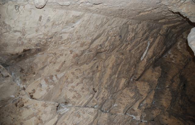 See entire tombThis corridor lies on axis with the tomb's entrance and is unfinished. Rock loss has occurred in the ceiling, perhaps during its excavation in antiquity. The ceiling loss is centered at the point where four fractures meet - the major north-south fracture, and three other diagonal fractures. The ceiling fractures and loss may explain why the tomb was not completed.