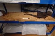 Although pillaged and flooded in antiquity, the tomb retained enough material to reveal an originally rich burial and the name Ahmose, identified as the King's sister and daughter of Seqenenre Tao. Ahmose was also the sister of Queen Ahmose Nefertari, and half sister of Ahmose I, the first king of the 18th Dynasty. She outlived her brother and sister and is thought to have been buried during the reign of Thutmes I, but the burial may have taken place under Ahmose or Amenhotep I. Names of the princess and her parents were written on an inscribed cloth found in the tomb. The mummy of Princess Ahmose was discovered by Ernesto Schiaparelli (1903-1905) together with her funerary goods, which included fragments of her Coffin, fragments of twenty different chapters of the Book of the Dead written on linen (the oldest known example at the time of Schiaparelli's excavation), and leather sandals. All of the artifacts are now housed in the Turin Museum. Schiaparelli presumed that the mummy of a relatively tall person of advanced age was that of the princess and was puzzled by the lack of Canopic jars, given that the remains of a Canopic chest were found and that they are often recovered in previously pillaged tombs. The Franco-Egyptian Mission last cleared the tomb in 1984.