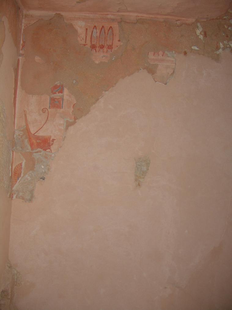 The tomb has suffered intense heat damage, but surfaces are not fire blackened except for small areas on the east wall of corridor (B). A horizontal line of heat alteration is also visible in corridor (B), particularly noticeable in the pigment alteration from yellow to red, at the lower parts of the west wall. The base of the wall was perhaps protected by sand or debris so that the fire only affected the upper parts of the tomb. The plaster has also become rigid and brittle, cracking and detaching from its substrate, and is lifting in areas. The burial chamber has suffered the most heat alteration, though the plasters in the rear side chambers are also heat damaged and fragile with severe cracking and detachment. Areas of painting in the corridor also show other forms of deterioration. The upper border Kheker frieze has an unusual pattern of loss where the red circles are almost entirely lost leaving only a ring of red. This suggests an application of a varnish in specific areas that has led to preferential loss. The blue paint appears to be almost completely lost in areas, sometimes with the upper plaster layer gone as well. The pigment was very thickly applied directly onto the plaster instead of over a layer of black, as was typical, so that its appearance is paler than normal. Black resinous-looking drips are also found on the walls in the corridor. Staining, probably due to bat activity, is evident in the rear of the tomb. Complete loss of decoration at the base of the walls indicates a strong possibility of flooding in this tomb. The regularity of the loss at the base of the wall in corridor (B) is particularly strange and gives the impression that these areas were possibly intentionally cut. Rock fissuring and loss of substantial infill material have also contributed to the fragmentary survival of the decoration that we see today.