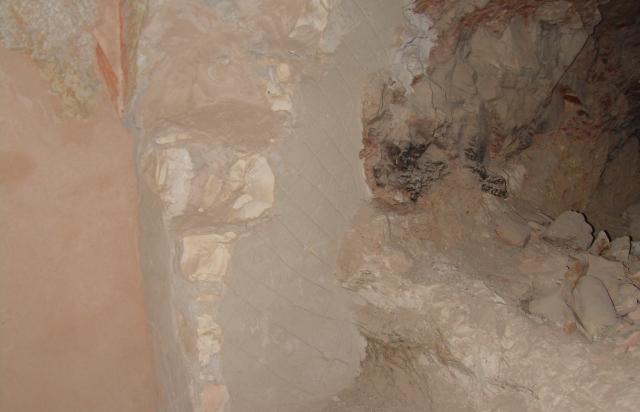 According to the GCI-SCA, the current condition of the rock is difficult to assess because of the large modern plaster repairs that cover most of the tomb today. A tilted open joint is visible on the exterior of the tomb on the west side of the entryway, but there is no evidence of recent movement or loss along it. The joint extends to a fracture in the west jamb of the entrance, but no further movement has occurred since the doorway was rebuilt. The ceiling of the burial chamber (C) is heavily fractured with substantial areas of loss, one of which may be recent and possibly ongoing. Losses most often occur along fissures in the rock and where substantial quantities of infill material were used. The burial chamber (C) walls have suffered the most loss of decoration. Surviving areas of decoration are fragile and detached, especially on the ceiling of burial chamber (C). There is also loss of decoration at the base of walls throughout the tomb.