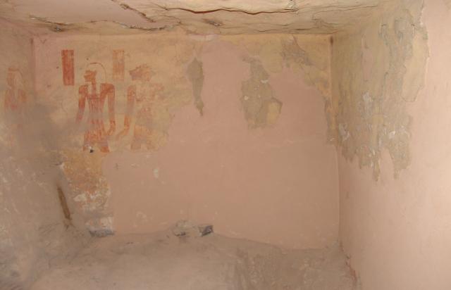 See entire tombThe walls of this side room have suffered damage and the decoration is only partly preserved. Only the north and east wall reliefs have survived. The north wall has representations of four unidentifiable male deities and the east wall has two of the four sons of Horus. The other two sons were most probably also depicted, but the painting and plaster have been lost.