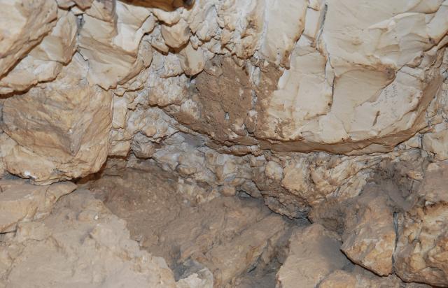 See entire tombA slightly descending Ramp provides access to this unfinished tomb. Roughly a quarter of the ramp is covered by a rock-cut Overhang. Remains of dry laid rubble masonry exist on both sides of the ramp. At some point, areas of stone loss along the ramp walls were repaired with mortar and stone chips. On the north wall of the ramp, several test patches of modern plaster have been applied.
