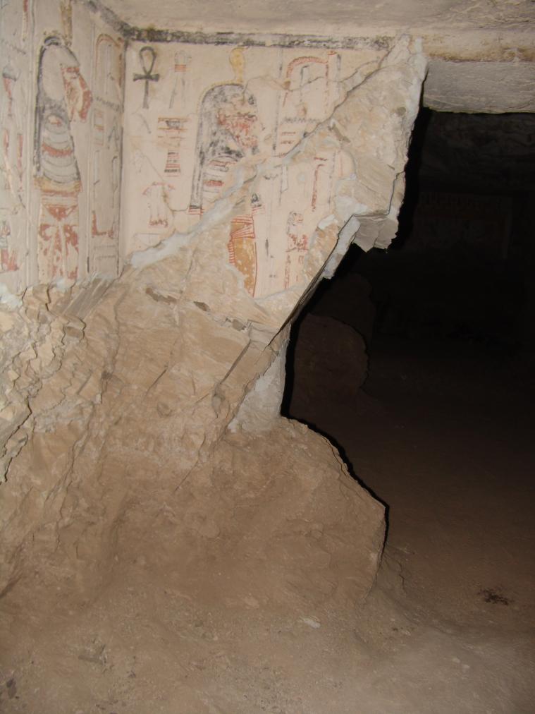 The condition and loss of the paintings is clearly connected to the lack of stability of the rock. The collapse of all but the highest parts of many of the walls mentioned above has left the remaining paintings essentially suspended and at high risk of continued loss. Cracks visible in the rock often continue into the painted plaster. Surviving areas of plaster are friable with a network of cracking, and in some cases have detached from the rock support below. Surface pitting of the paintings in chamber (C) is also indicative of salt activity. Other surface conditions include flaking and loss of the upper paint and plaster layers, and a noticeable loss of the white background of the paintings. Lower sections of the walls were already lost by the early 1800s, presumably victims of cyclical flood events. Clearing of debris from around the tomb walls by the Franco-Egyptian Mission in the 1970's and 1980's may have caused further instability of the lower parts of the surviving walls. The University of Cairo geotechnical study determined that multiple floods had affected the stability of the tomb by causing fracturing of the rock that led to the collapse of walls and ceiling rock. Two major fault zones and a number of joint planes dipping steeply toward the south have contributed to chamber wall and ceiling collapse. The 1994 flood had a significant impact, the floodwaters scattering archaeological finds stored in the tomb and leaving a thick layer of mud on the floor, now dried and cracked. The tomb continues to be threatened by flooding, being adjacent to the main drainage channel, which is fed by the catchment area.