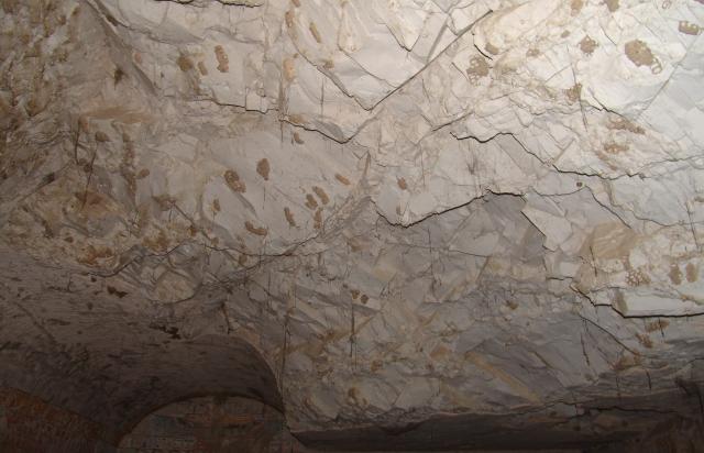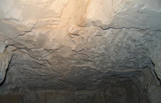 Recent significant rock loss and enlarged fractures are likely the result of the 1994 flooding. Large areas of the ceiling of chamber (B) have collapsed in the past. Extensive rock collapse is also apparent in rear chambers (C) and (Cb), and the presence of heavily fractured ceiling rock in these chambers constitutes a high risk of future collapse. Wooden post and beam shoring has been installed in rear chambers (C) and (Cb) to support the ceiling rock and surviving upper portions of collapsed walls. Substantial amounts of salts are present as fracture infill and as efflorescence and crusts on rock surfaces, particularly in gate (C) and along the rear wall of chambers (C) and (Ca). When activated by moisture these salts will continue to cause mechanical damage and eventual loss of material.