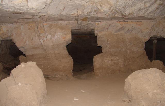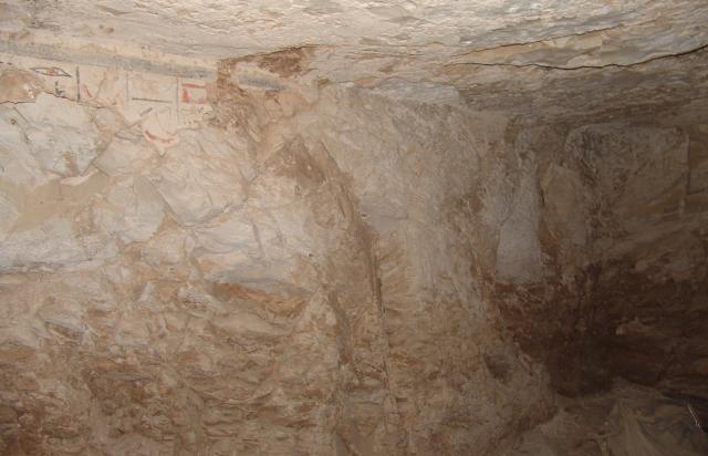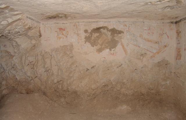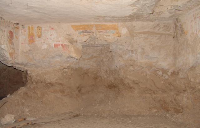 See entire tombNow one large chamber, this side chamber was originally two separate side chambers. The wall separating the two chambers has collapsed and threatened the stability of the room. Due to the severe damage, only fragmentary decoration remains, particularly spell 180 of the Book of the Dead on the western wall.