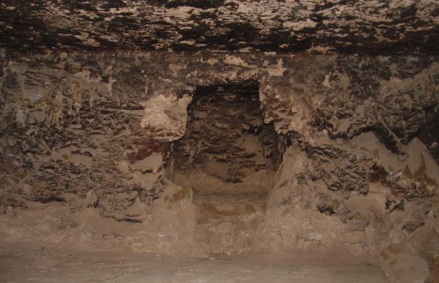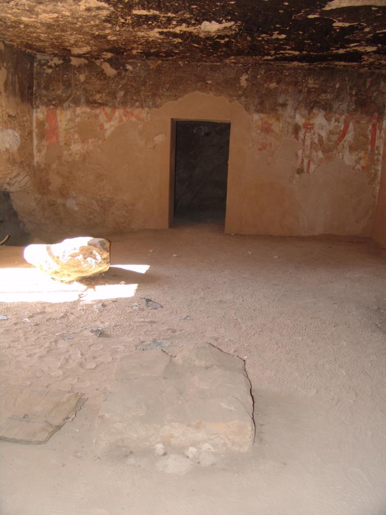 See entire tombThis side chamber lies to the north of the burial chamber. There is some rock loss in the south wall and the walls have a heavy matte blackened appearance from fire. This chamber was not plastered or decorated.