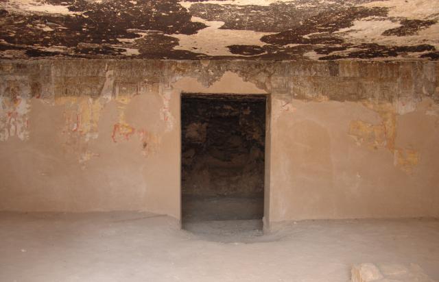 See entire tombThis gate is cut into the western wall of pillared chamber B and provides access to a side chamber. The jambs have been reconstructed with a substantial amount of repair plaster. The extent of loss in this area suggests that the rock suffered severe damage possibly caused by flooding.
