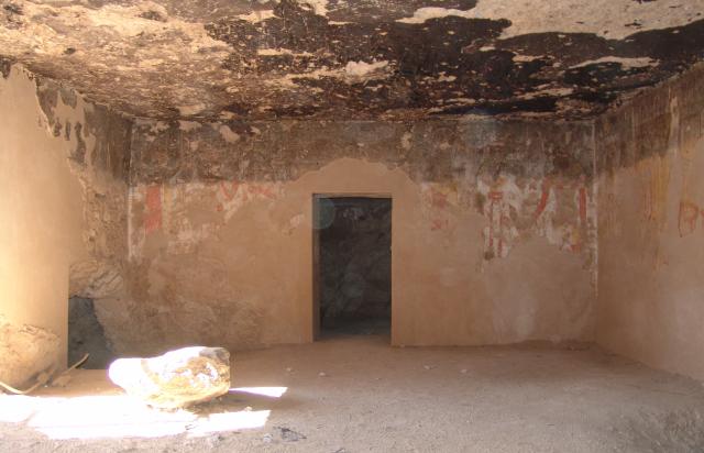 See entire tombThis side chamber lies to the east of the pillared chamber. The walls and ceiling have limited areas of blackening, indicating that it may have been closed off and protected from fire. There is, however, substantial loss of the upper painted plaster layer, though this chamber has significantly more remaining than side chamber Ba.