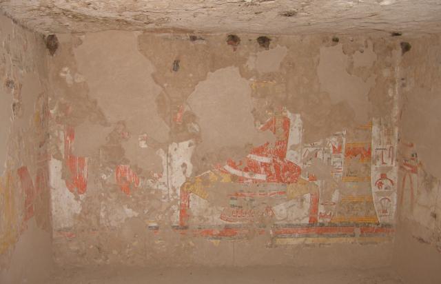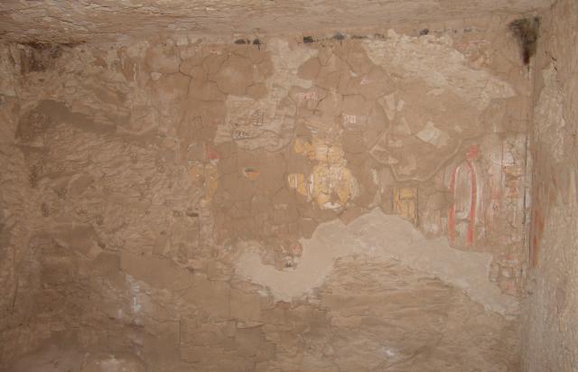 See entire tombThis side chamber lies to the west of the pillared chamber. The walls have limited areas of blackening from fire, indicating that it may have been closed off and protected from fire. The decoration in this side chamber suffers from severe cracking of the entire plaster stratigraphy. There is substantial loss of the upper painted plaster layer.