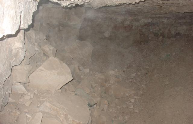 According to the GCI-SCA, the tomb shaft (A) appears stable. The ceiling of chamber (B) is extensively fractured, though following an assessment by the GCI-SCA from 2006-2009, it has been judged to be stable. Silt was observed on the walls of shaft (A) and thick cracked, dried mud on the floor and ceiling of chamber (B), indicating past water infiltration, presumably during the 1994 flood. Trash had accumulated at base of shaft and was removed in 2007 and 2008. Water infiltration has likely impacted the stability of the tomb, particularly affecting the fragile shale into which the tomb is principally excavated. Flooding continues to be a serious threat due to the location of the tomb's unprotected shaft next to the main drainage channel.