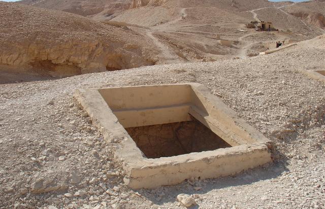 QV 8 lies on the south side of the main Wadi, between the paved path and the higher footpath to the south. The tomb has one chamber (B) and the shaft (A) has a modern masonry surround with cement plaster spanned by a metal grill. The tomb contains no decoration.