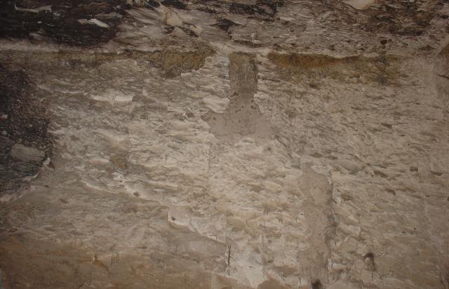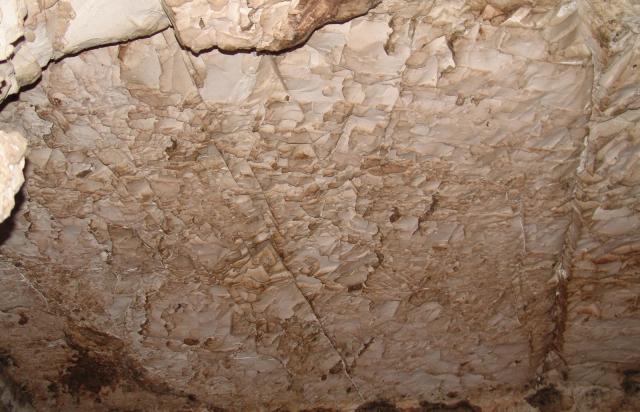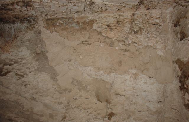 Two principal fault zones are present in the tomb, one running laterally (east-west) in chamber (B), and side chambers (Ba) and (Bb) where there is adjacent rock loss. The other fault zone is visible in the northwestern corner of the burial chamber (D). Salt infill of fractures and faults is present throughout the tomb. Extensive salt efflorescence and large crystal growth is present on the east wall of the burial chamber (D).