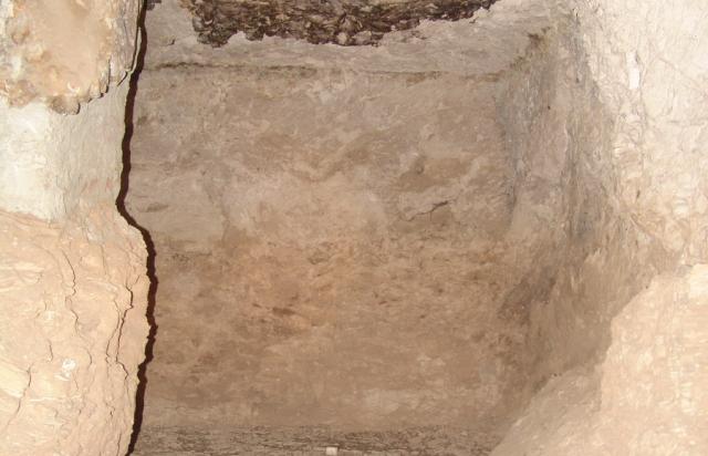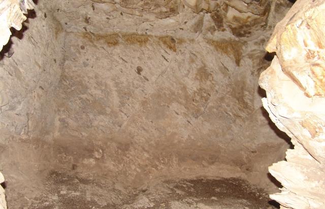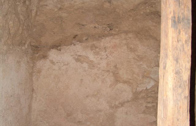See entire tombThis side chamber lies to the southwest of the burial chamber. It has little surviving decoration, consisting mainly of fragments of lower, infill packing plaster. As with the burial chamber, there is a sediment line along the walls and an overall loss of decoration at the lower parts, suggesting that it must have flooded in the past.
