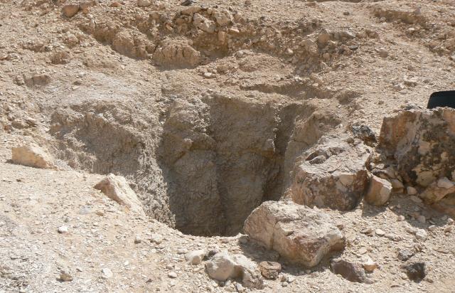 See entire tombA rough, eroded vertical shaft entrance that provides access to the tomb.