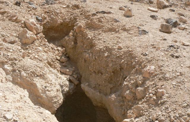 Concerns about structural stability prevented the GCI-SCA from assessing the interior of the tomb. The area immediately adjacent to the entrance is severely eroded and the shaft has been partially filled with debris. Erosion of the surrounding slope is the primary mechanism of decay. Water infiltration has also contributed to deterioration since the tombs were carved into a friable shale.